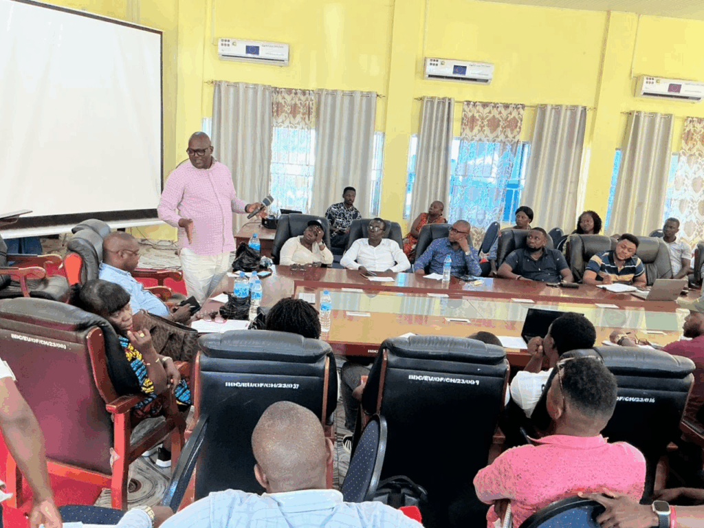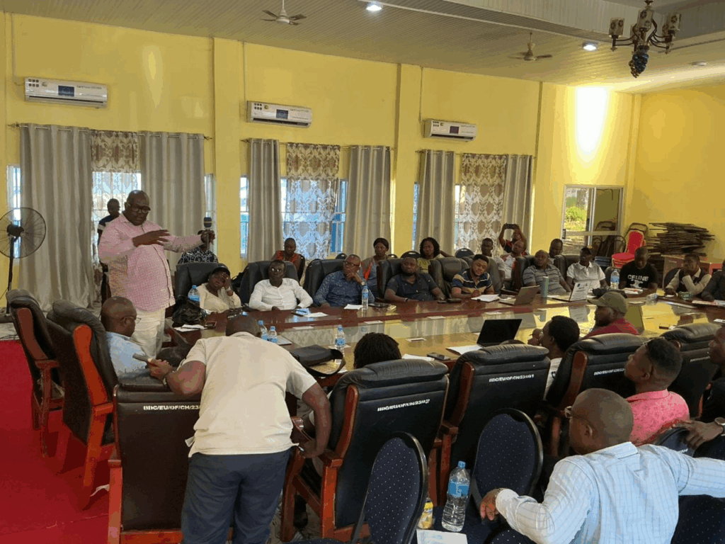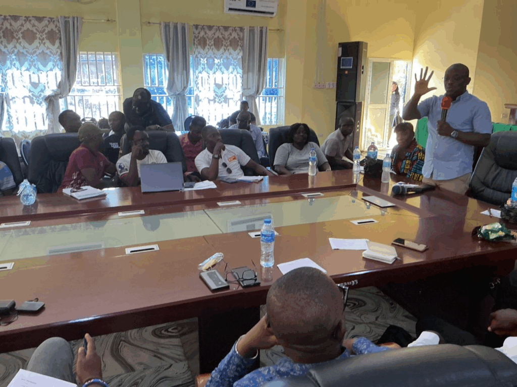 The Bombali District Council Chairman making statement at an engagement meeting with NGOs ,during the engagement meeting with the Director of NGOs Affairs at MOPED along with Madam Alice @ National Director SLANGO